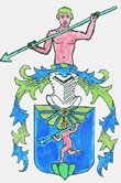 ![]() " d'azur à un sauvage de carnation tenant de ses deux mains une lance d'argent posée en barre, courant sur un mont de trois copeaux de sinople et, mouvant du chef, un oeil rayonnant d'or." (source: AEF, fichier armoiries; Armorial Comba III; Armorial Comba 1828/1846) |